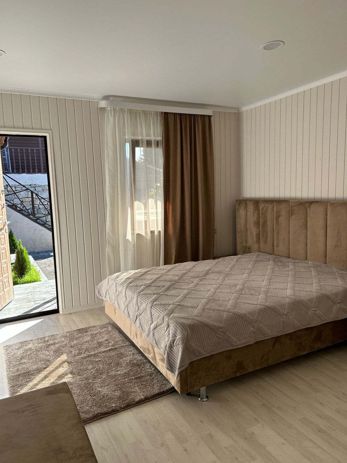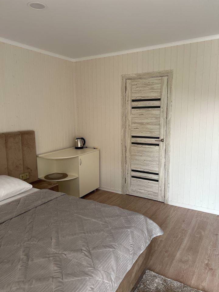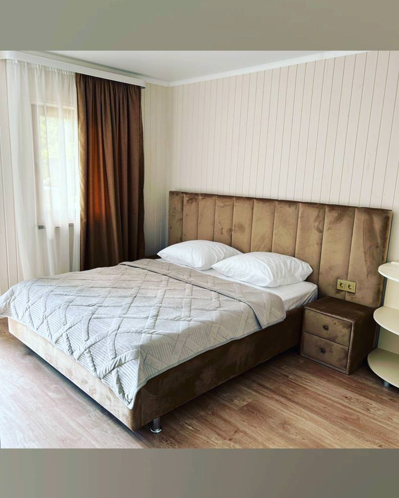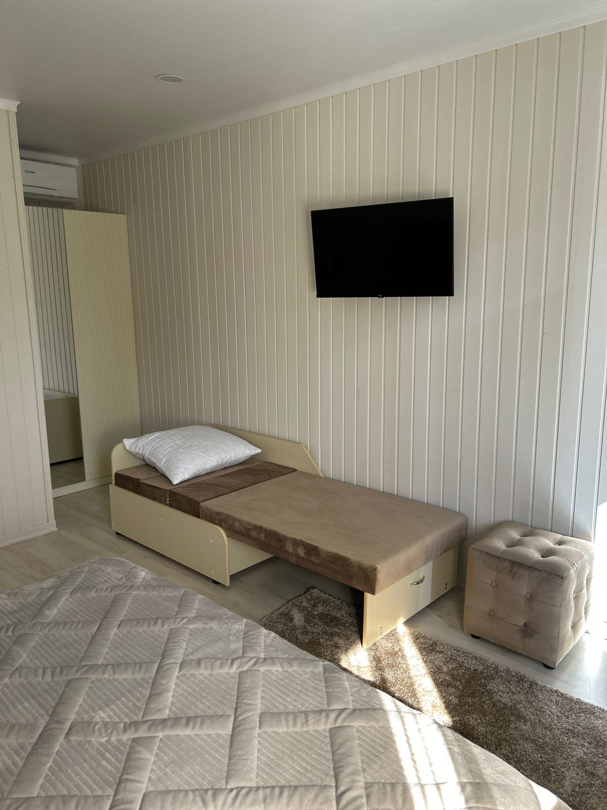 Площадь номера - 20 кв.м. 2 осн. места. 1 доп. место. Мебель: вешалка, диван, зеркало, кровать двуспальная, прикроватные тумбочки, пуфик, стол, шкаф. Оборудование: кондиционер, телевизор, холодильник, электрочайник. Санузел: с душем, фен. Сервис: Wi-Fi бесплатно, смена полотенец, смена постельного белья, уборка номера.